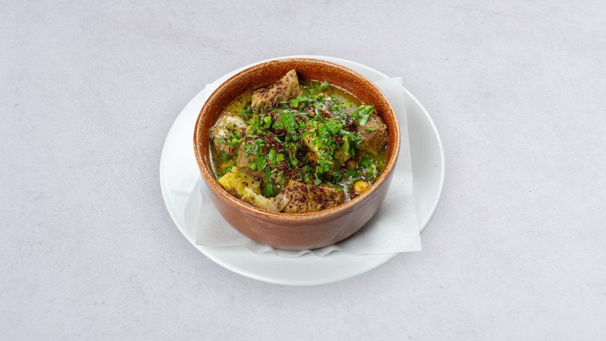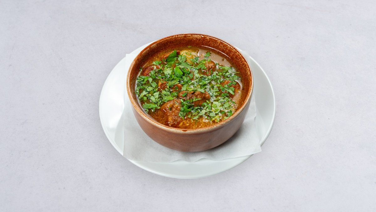 Azerska zupa z filetem z kurczaka, ziemniakami, pomidorem i cebulą. Z szafranem, kurkumą, kolendrą, czosnkiem i sokiem z granatu