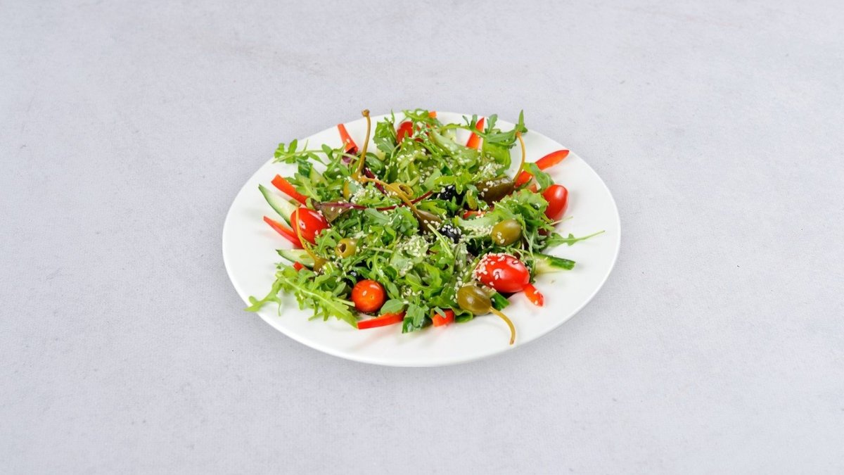 Mix sałat, pomidor, ogórek, oliwki, papryka, cebula, oliwa z oliwek, sezam