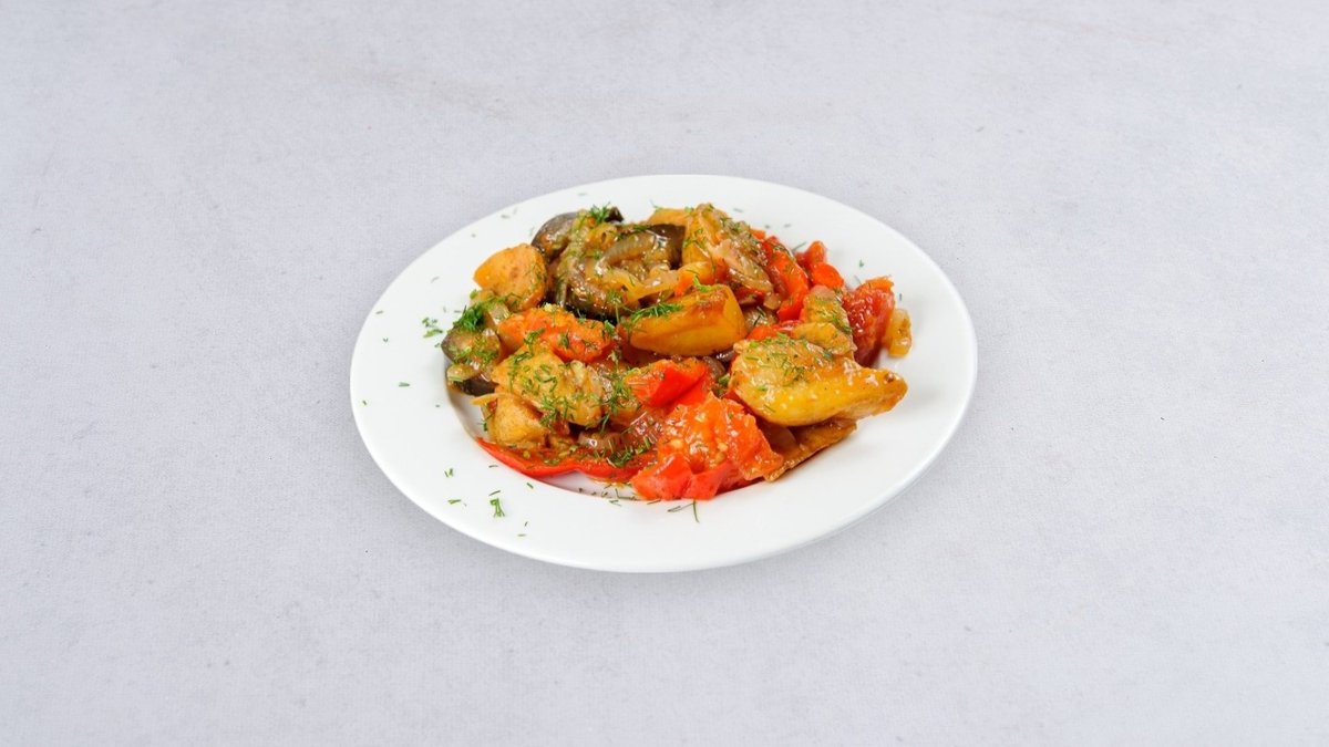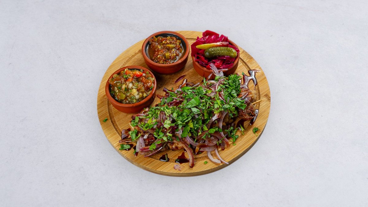 Filet z kurczaka z cebulą i sosem z granatu. Podawany z przystawką adżapsandal, piklami i adżiką