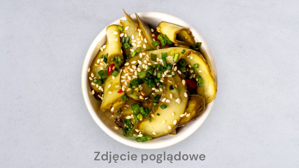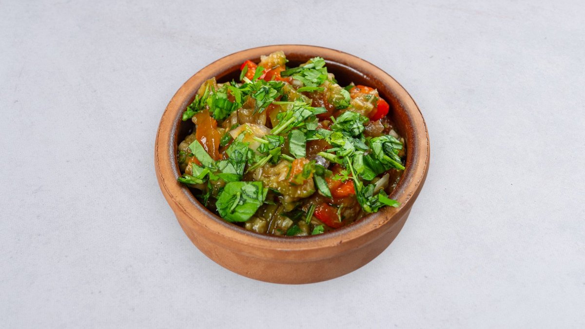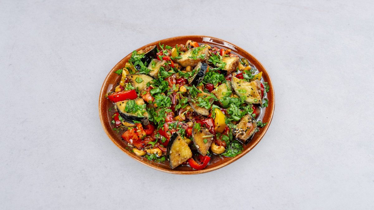 Azerska sałatka z pieczonym bakłażanem, pomidorem, papryką i cebulą, z kolendrą, orzechami nerkowca, sezamem. Sos na bazie adżiki, soku z granatu i oliwy