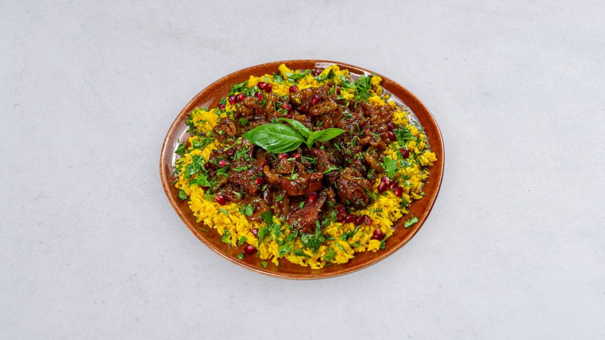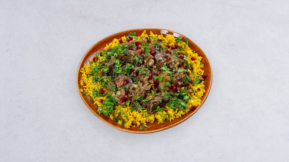 Kurczak duszony z cebulą, orzechami i sosem z granatu. Doprawiony ostrą papryką i czosnkiem. Podawany z ryżem