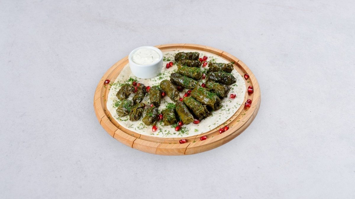 Cielęcina z ryżem i ziołami zawijana w liście winogron. Podawana na tortilli z sosem jogurtowo-czosnkowym