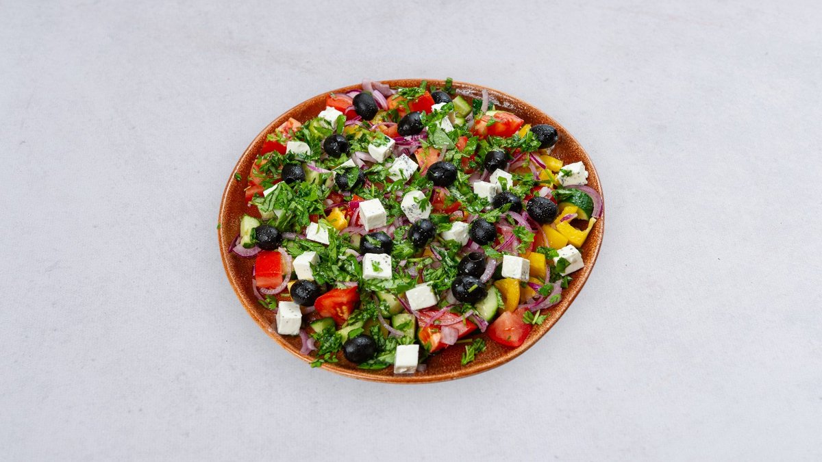 Azerska sałatka z pomidorami, papryką, ogórkami, oliwkami, ziołami, cebulą i serem feta. Skropiona oliwą