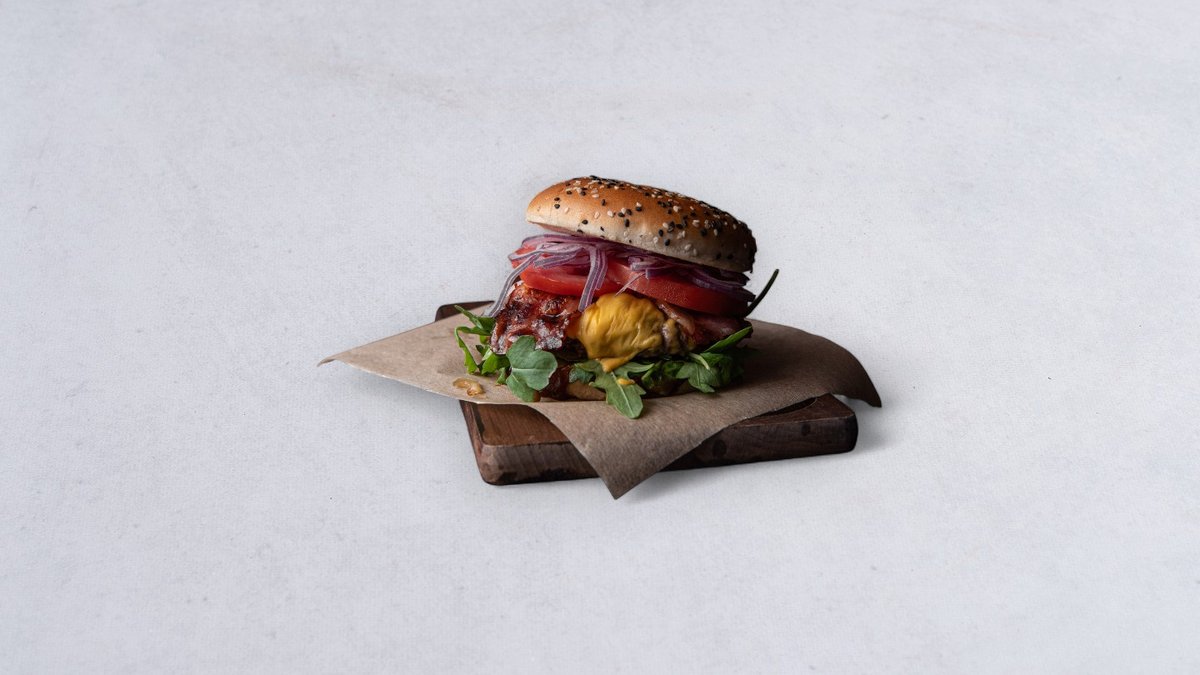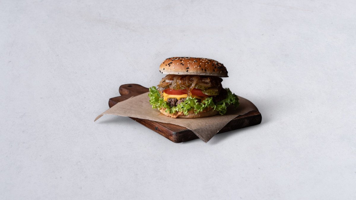 Bułka brioche, kotlet wołowy, ser cheddar, pomidor, karmelizowana cebula, liść sałaty, pikle. Sos: Prohibition.