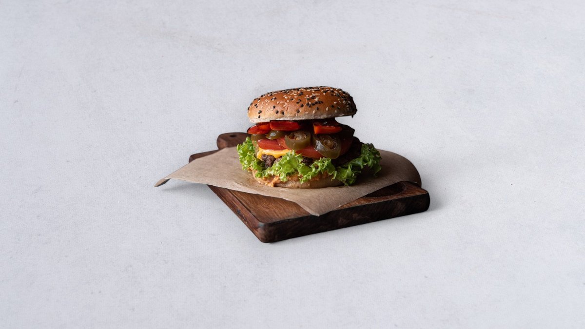 Bułka brioche, kotlet wołowy, ostry cheddar, grillowana papryka, pomidor, jalapeño, liść sałaty, czerwona cebula. Sos: Hot Chipotle.