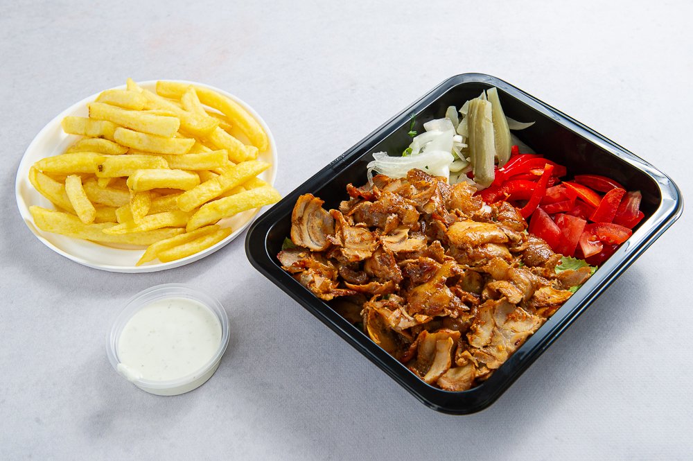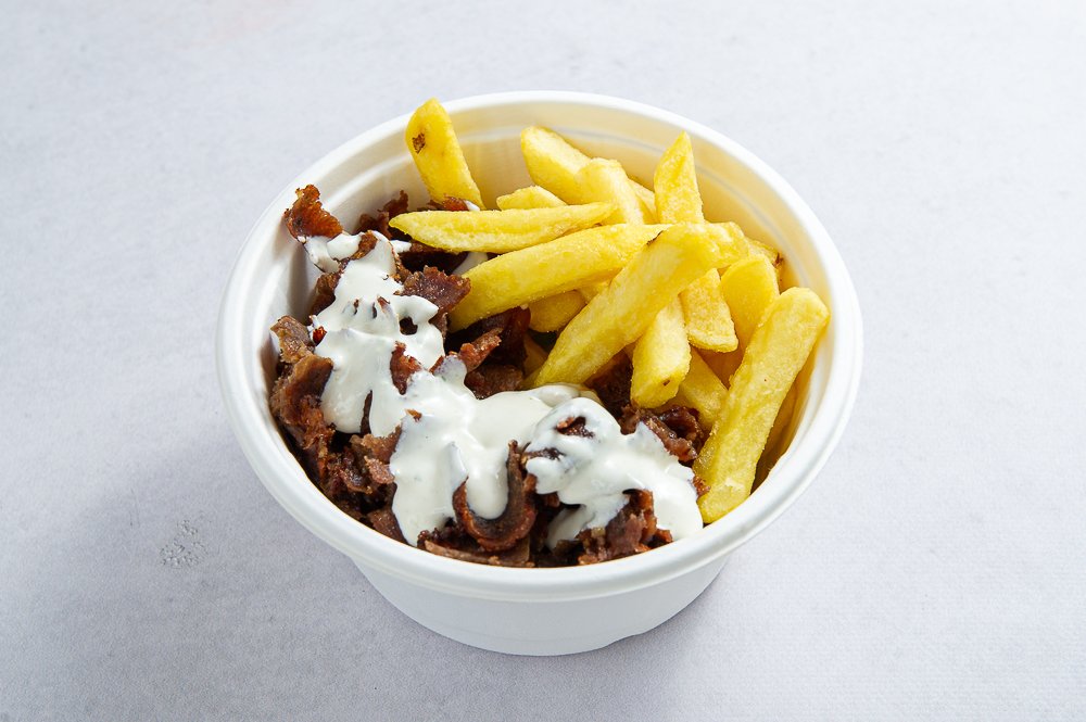 Mięso, mix warzyw, frytki ,ser, sos, pasta czosnkowa