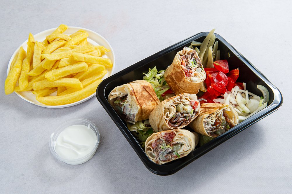 Mięso, mix warzyw, frytki ,sos, pasta czosnkowa