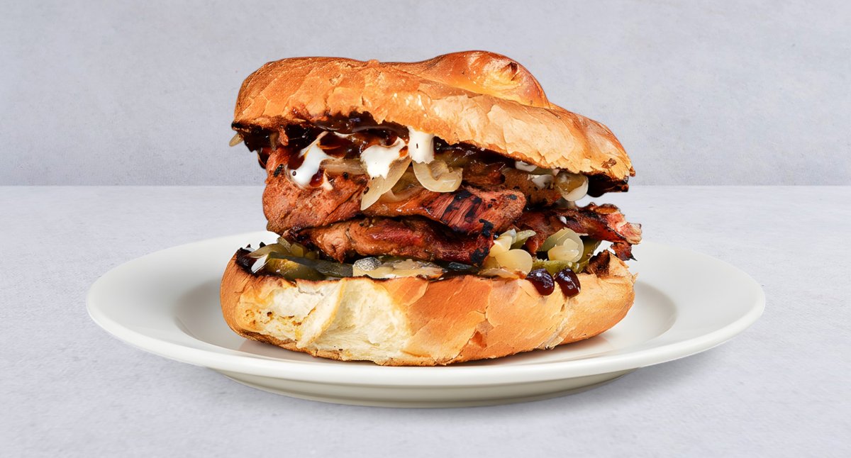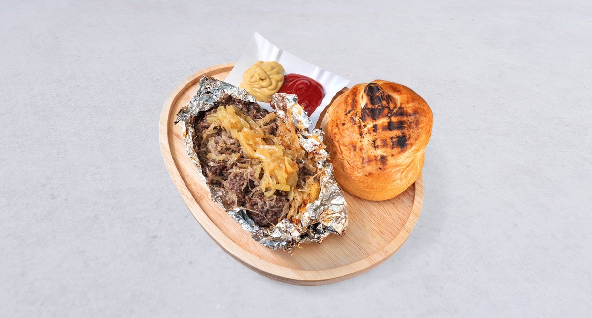 Podpieczona bułka ślimak, około 125 g grillowanego mięsa do wyboru: stek, filet lub udko, sosy, smażona cebulka, ogórek kiszony. Do dania została doliczona opłata w wysokości 0.31 zł za opakowanie