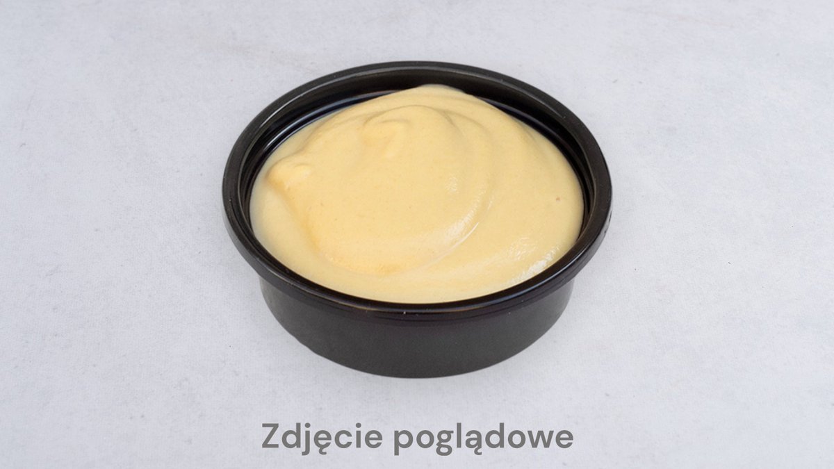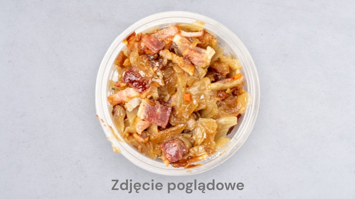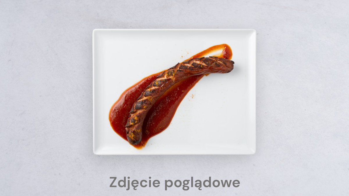 Podpieczona bułka ślimak, 1/2 smażonej na ogniu kiełbaski, smażona cebulka, ogórek kiszony, sosy. Do dania została doliczona opłata w wysokości 0.31 zł za opakowanie