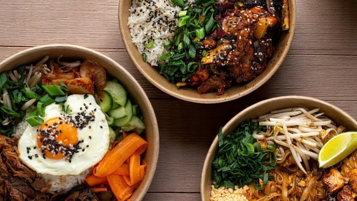 Ryż, marynowany ogórek, marynowana marchewka, kiełki fasoli mung, gomawakame, kimchi, grzyby shitake, jajko sadzone, dymka, sezam