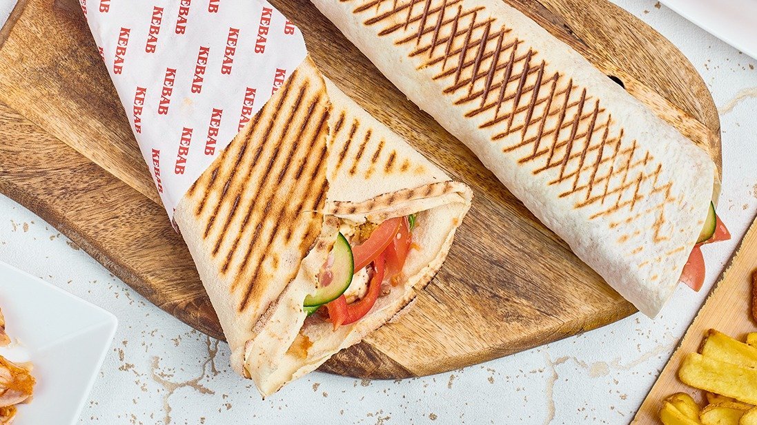Sos czosnkowy, Sos szaszłykowy, Bulka Berlin, Kapusta pekińska, pomidory, ogórek, mięso, koperek.
