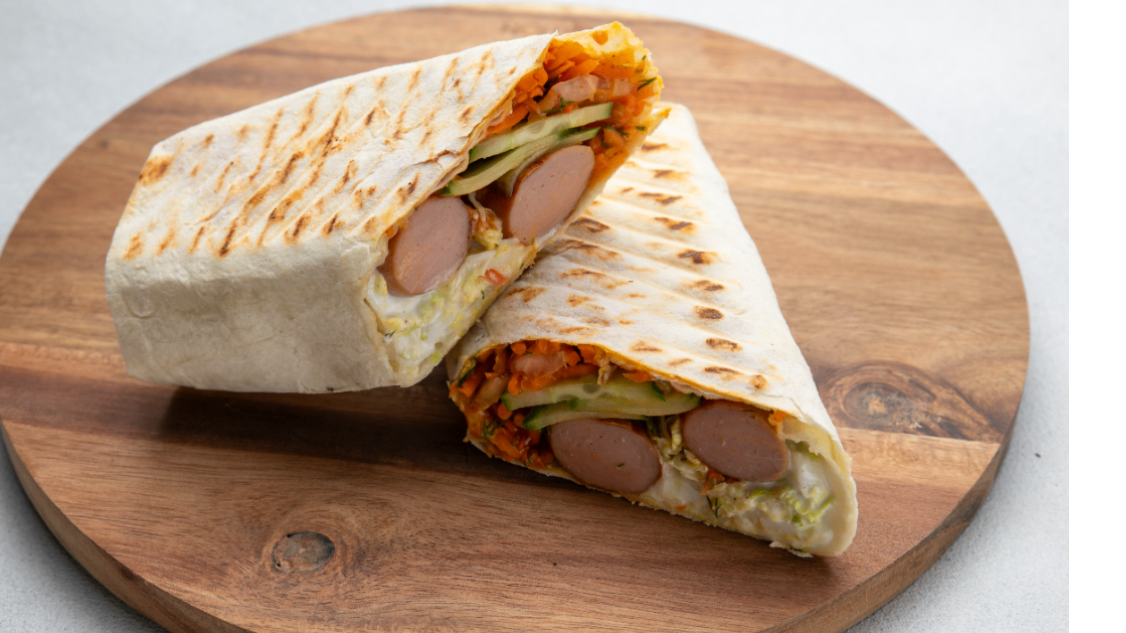 2 parówki wędzone sos czosnkowy, keczup, musztarda, kapusta pekińska, świeży pomidor, świeży ogórek, koreańska marka, świeży koperek.