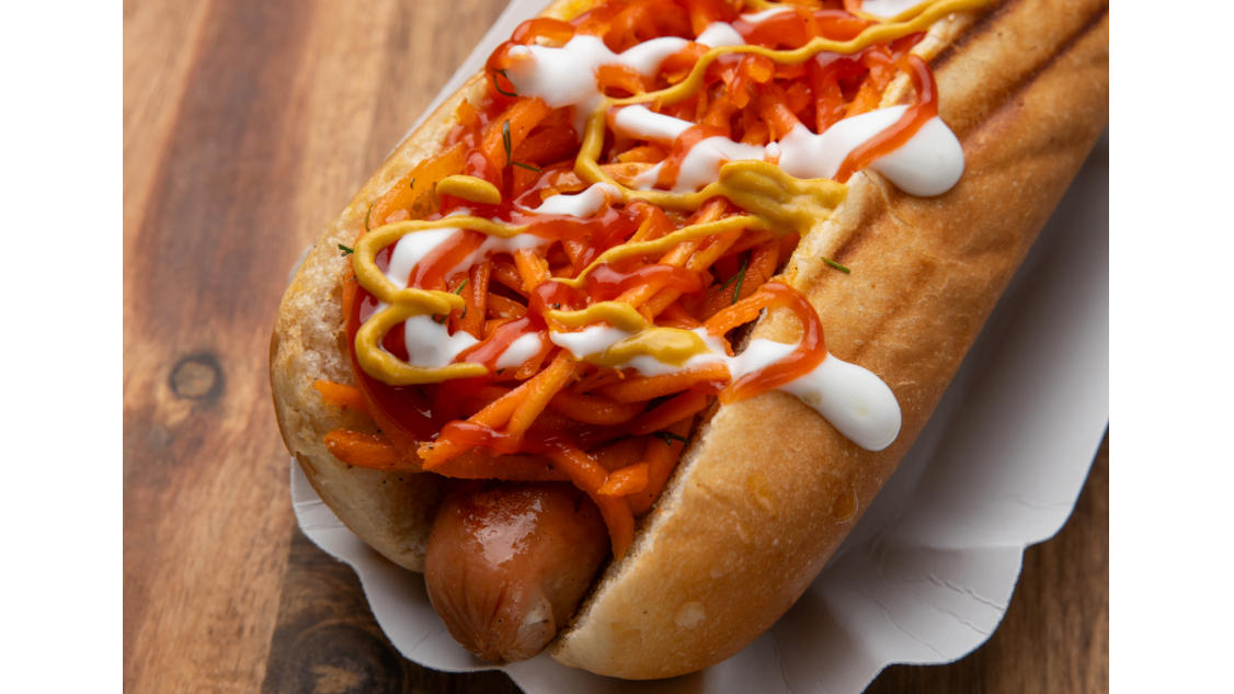 Skład: 1 parówka z kurczaka i wieprzowiny, bułka, sos czosnkowy, chetchup, musztarda, makrkówka po koreańsku.