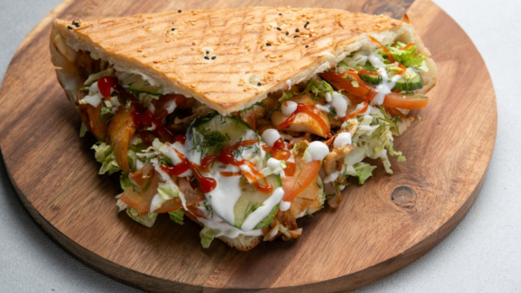sos czosnkowy, mięso z kurczak filet, kapusta pekińska, świeży pomidor, świeży ogórek, świeży koperek.
