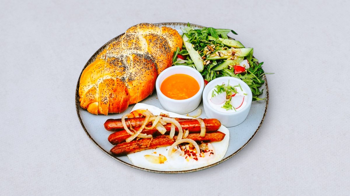 chałka, 2 jaja sadzone z płatkami chili, 3 kiełbaski wege od BezMięsny z podsmażaną cebulką, domowy ajvar, twarożek z rzodkiewką, sałatka