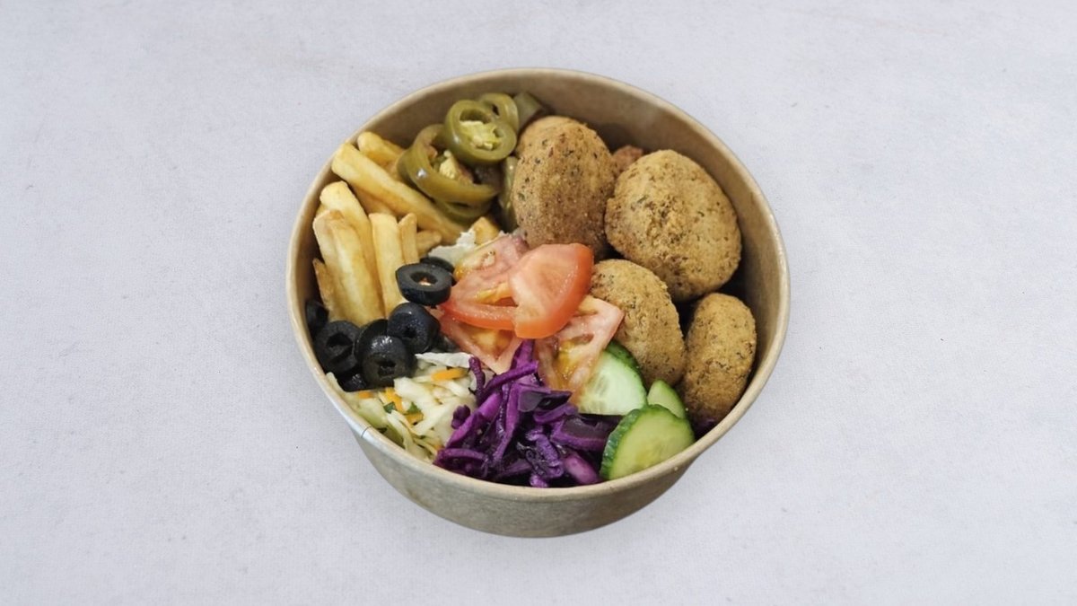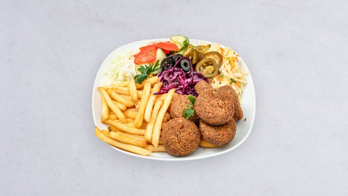 Falafel, frytki, surówka, sos