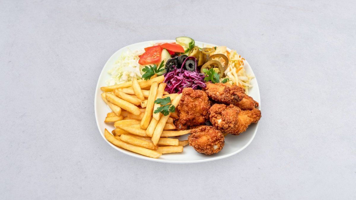 Skrzydełka, frytki, surówka, sos