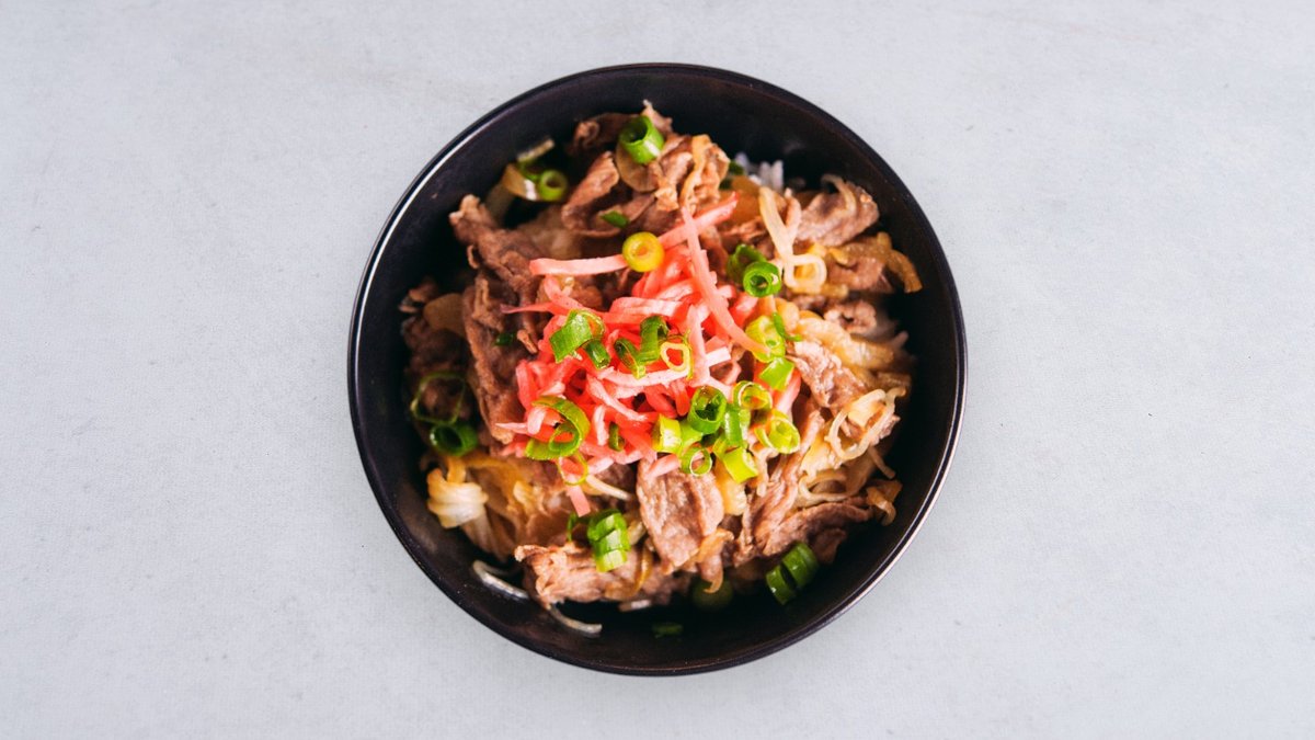 Wołowina, cebula, makaron shirataki, czerwony imbir, negi, japoński rosół, ryż