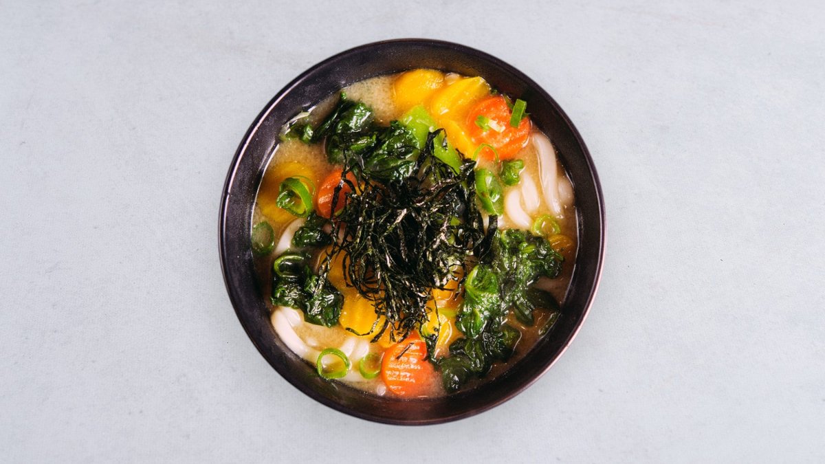 Warzywa, miso, sos sojowy, szpinak, wodorosty, cebula, makaron udon