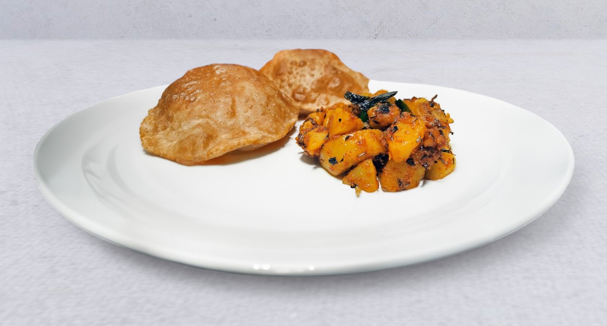 Klasyczne połączenie łagodnego w smaku ziemniaczanego curry podawanego z gorącymi, puszystymi puris.