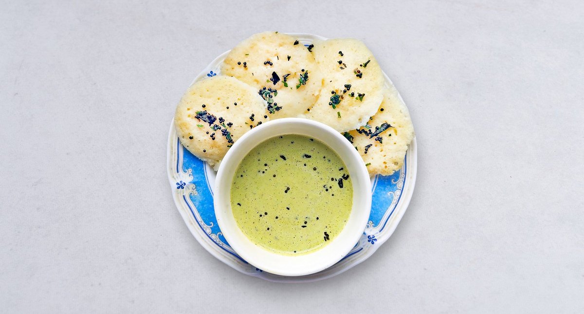 Paszteciki z semoliny, podawane z specjalnym chutneyem kokosowym (sosem) i sambar (gulasz warzywny na bazie soczewicy)