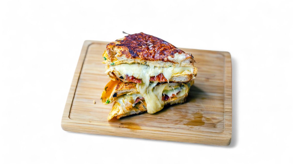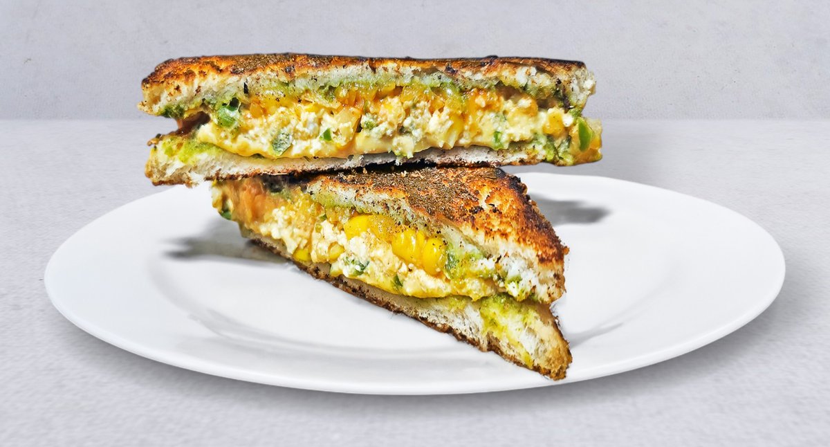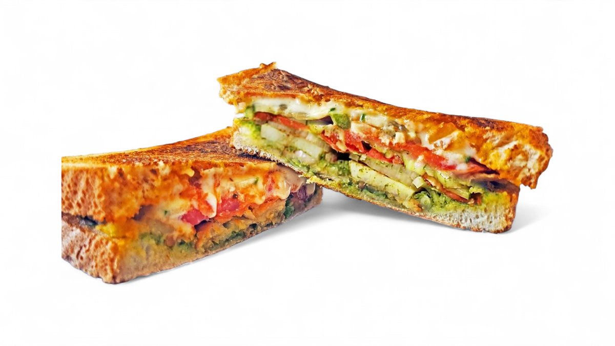 Pyszny wegetariański tost polany masłem kolendrowym i połączony ze świeżym soczystym pomidorem, ziemniakiem, chrupiącą papryką i cebulą, a wszystko to z pikantnym Cheddarem w tostach grillowane do uzyskania chrupiącego brązu.