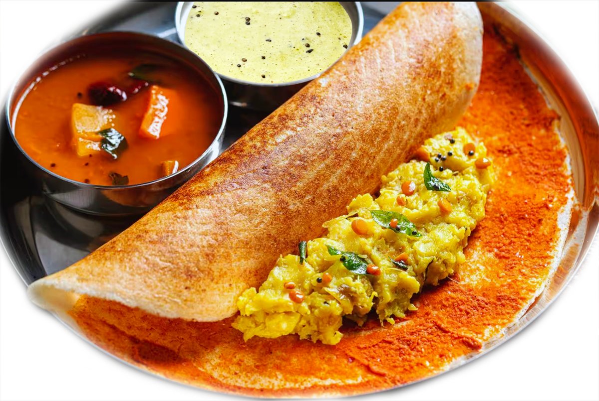 Aromatyczne ziemniaki obłożone krepą. Podawane z bogatym chutney kokosowym (sosem) i sambarem (gulasz warzywny na bazie soczewicy).