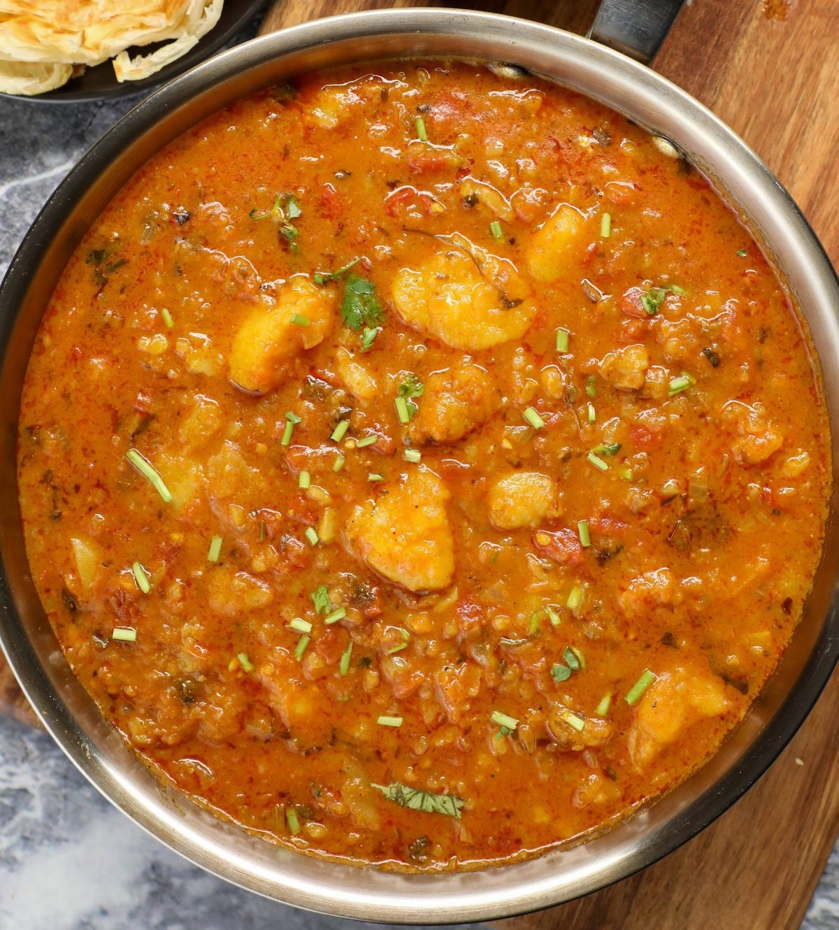 Łagodne w smaku ziemniaczane curry podawanego z gorącymi, puszystymi puris
