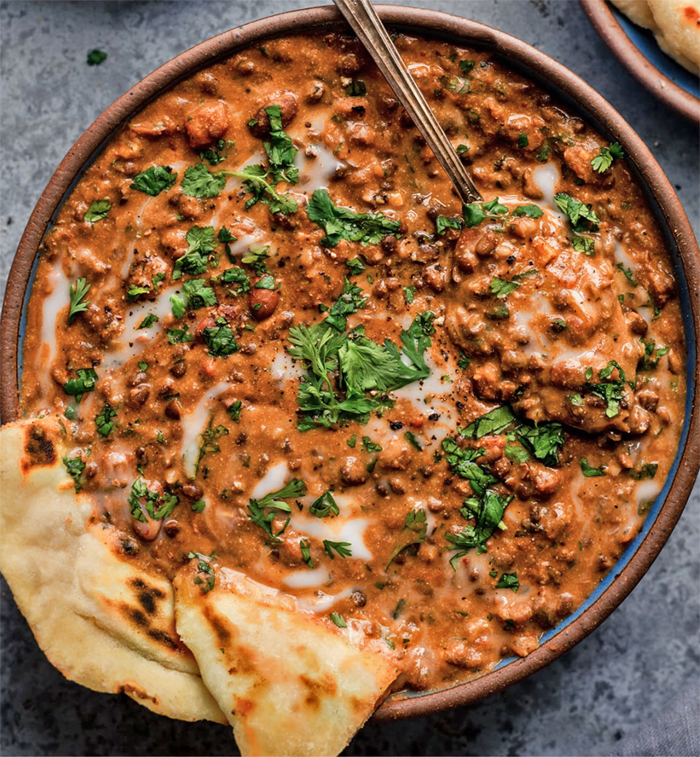Królewskie danie wegetarian - soczewica i fasola gotowane na wolnym ogniu z przyprawami, masłem, czosnkiem, śmietaną i pomidorami, aby uzyskać aksamitną i luksusową konsystencję. Podawana z ryżem lub indyjskim płaskim chlebem (paratha) i ziemniakami smażonymi z przyprawami i kminkiem (jeera alu).
