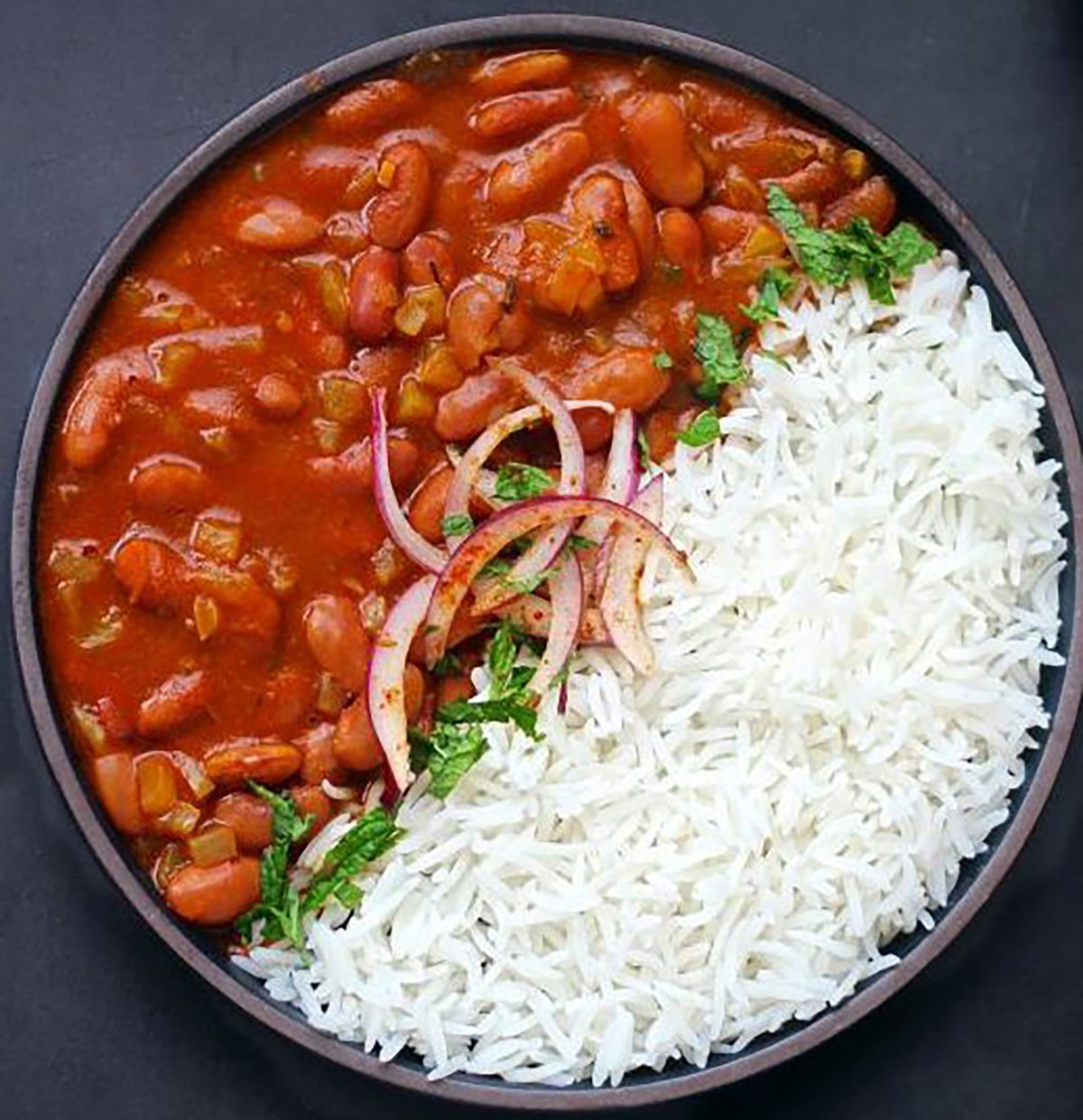 Zdrowe wegańskie i bezglutenowe danie, pełne smaku i pyszne. Fasola Kidney jest gotowana na wolnym ogniu w aromatycznej bazie curry w połączeniu z ryżem basmati gotowanym na parze. Podawane ze słodkim lassi (smoothie)