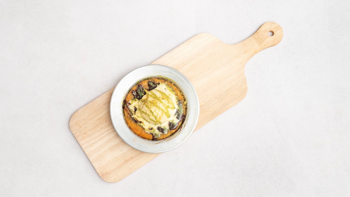 Kunafeh z kremem pistacjowym, lodami waniliowymi i syropem