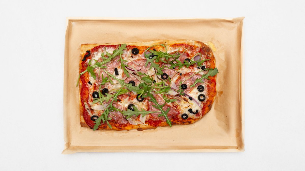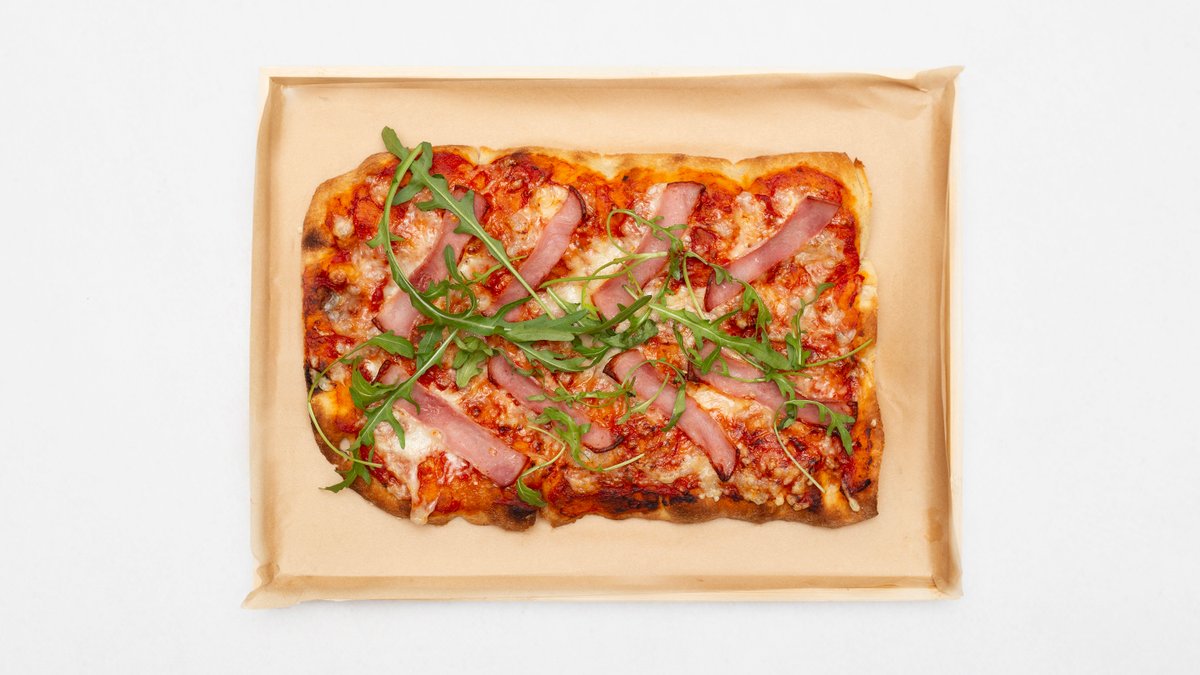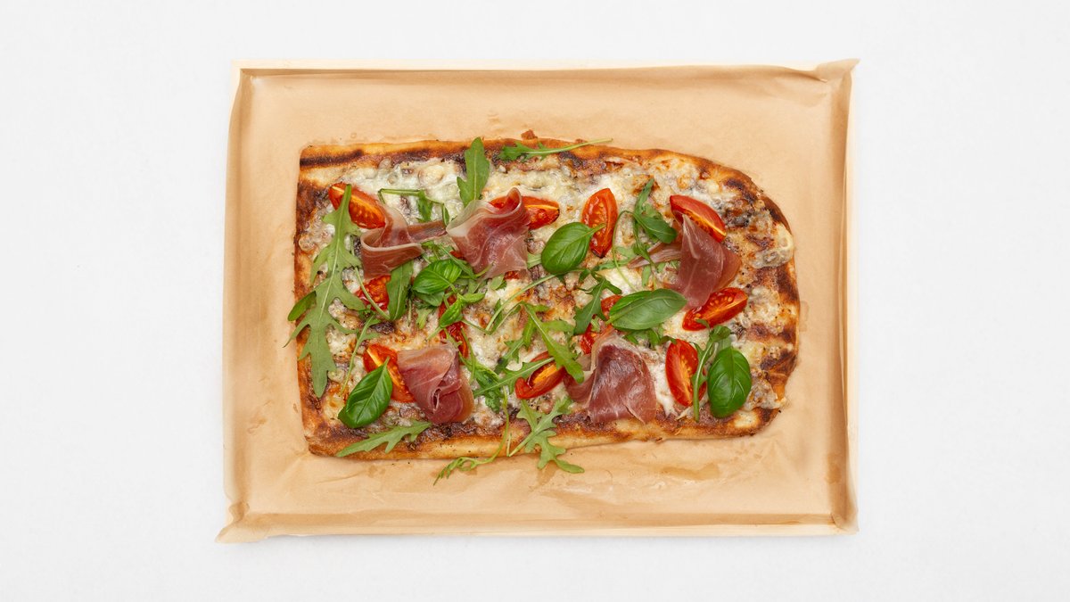 265 g. Biały sos, pomidorki, ser, szynka dojrzewająca, bazylia, rukola