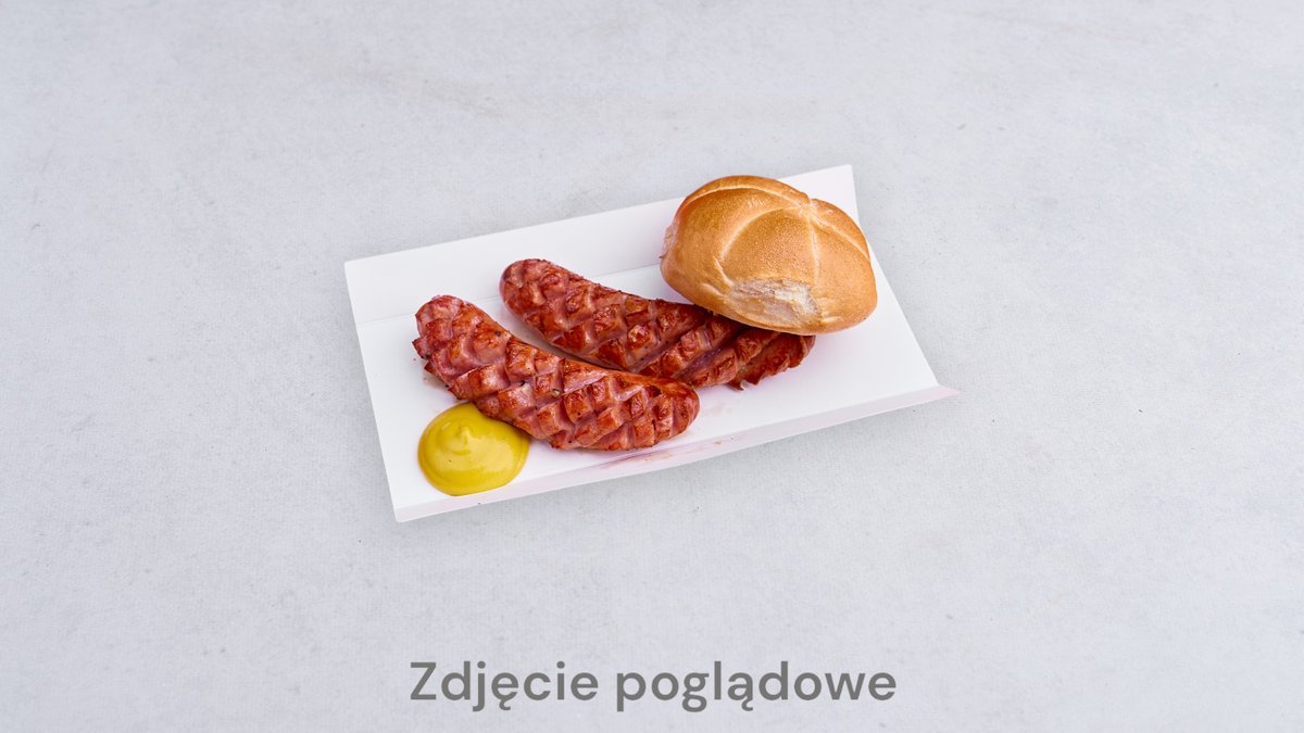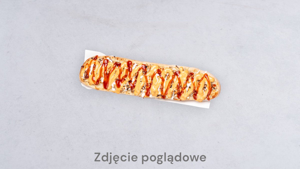 z sosem pomidorowym, serem mozzarella, parówką, sałatą, cebulą prażoną, ogórkiem konserwowym w plastrach, oregano, dodatkowo polana sosem czosnkowym Zdjęcie poglądowe