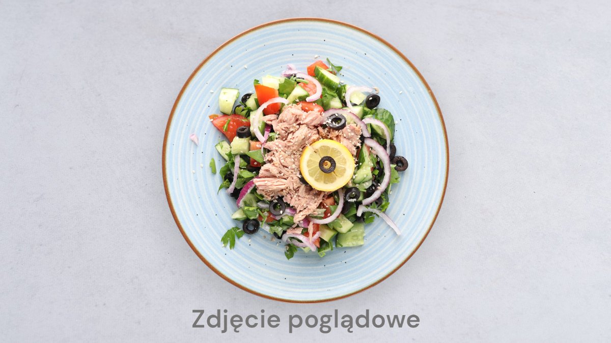z sosem pomidorowym, serem mozzarella, tuńczykiem, oliwkami, cebulą i oregano Zdjęcie poglądowe