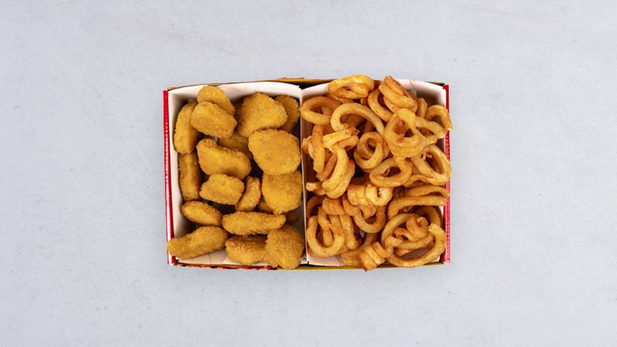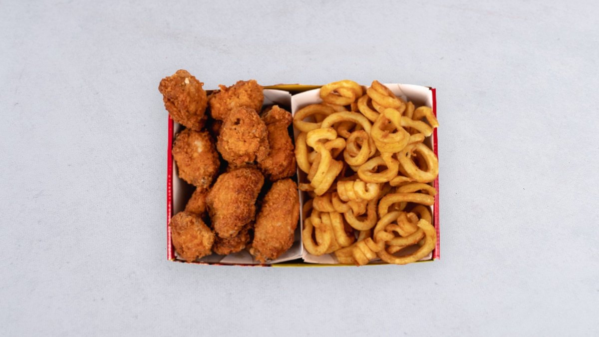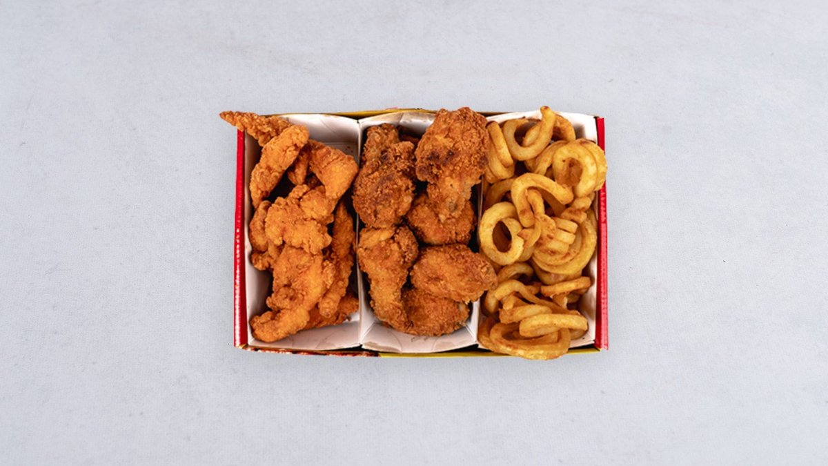 Skrzydełka ostre 10 szt., stripsy 12 szt., frytki zakręcone 400 g