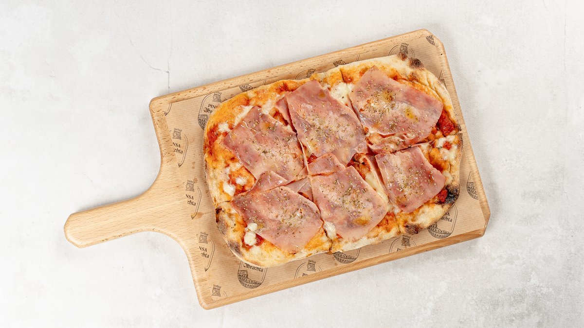 Sos pomidorowy, mozzarella, szynka cotto, oliwa evo, oregano