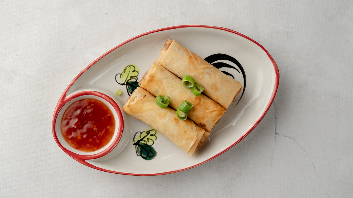 Chrupiące warzywne sajgonki serwowane z sosem słodkim z chili. Danie zawiera sos rybny.