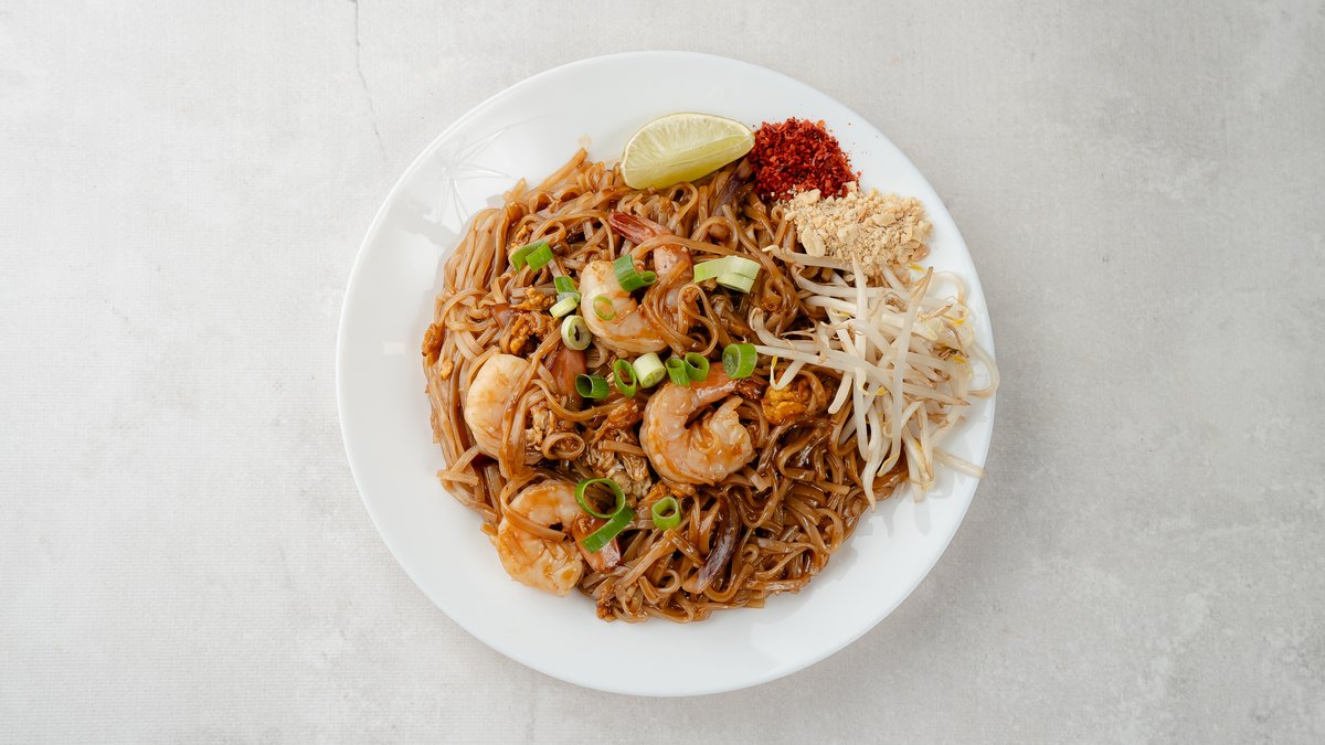 Słynny Tajski Stir Fry z makaronem ryżowym. Makaron ryżowy, jajko, czerwona cebula, kiełki fasoli, orzeszki ziemne, sos z tamaryndowca, chili. Danie również zawiera sos rybny. *Pad Thai z krewetkami zawiera 4-5 krewetek w zależności od ich wielkości