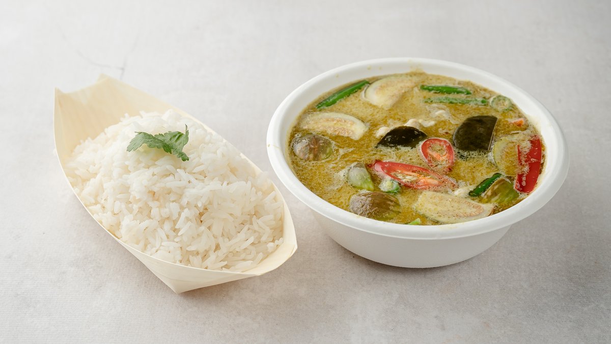 Prosto z południa Tajlandii. Zielone, Czerwone, Żółte, Massaman, Penang, sos rybny. (Inne każdego tygodnia - proszę pytać) Ryż pakowany osobno Opcje do wyboru