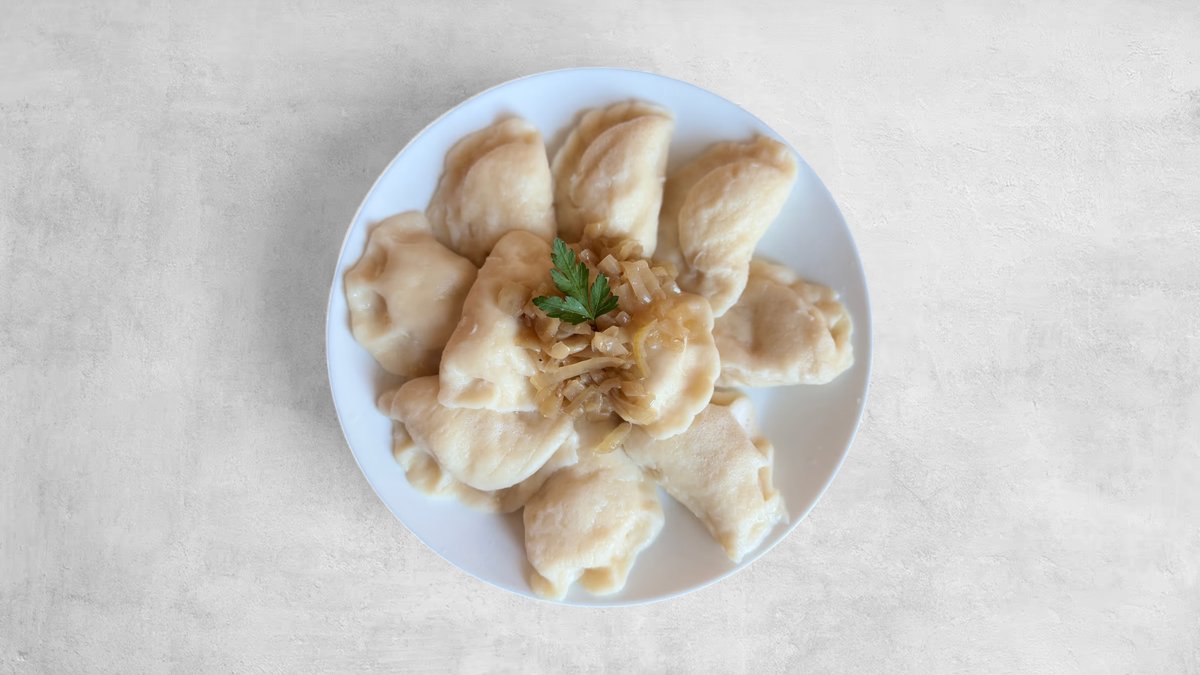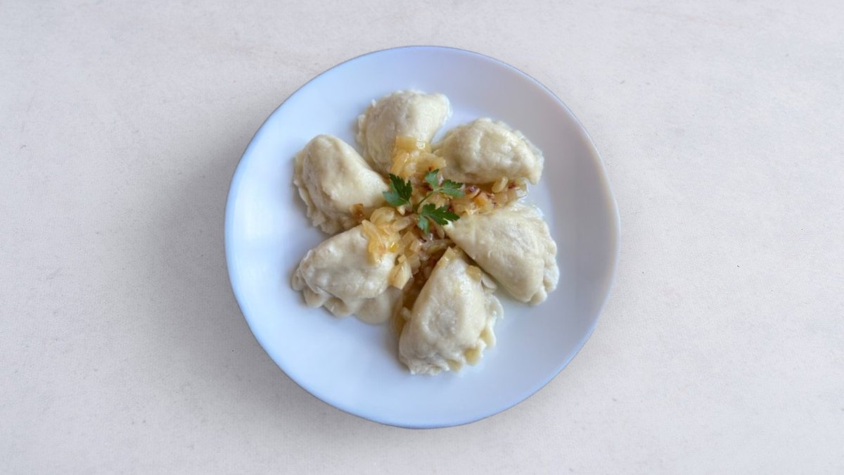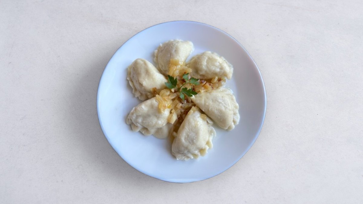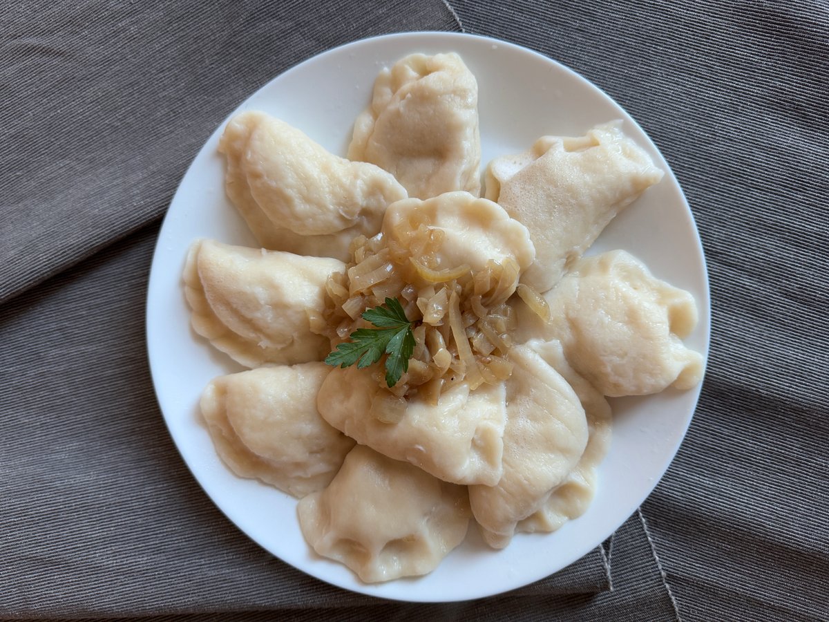 6 szt. Domowe, ręcznie robione z serem, ziemniakami i cebulą. Sposób przyrządzenia do wyboru. Dodatek do wyboru. Zdjęcie poglądowe