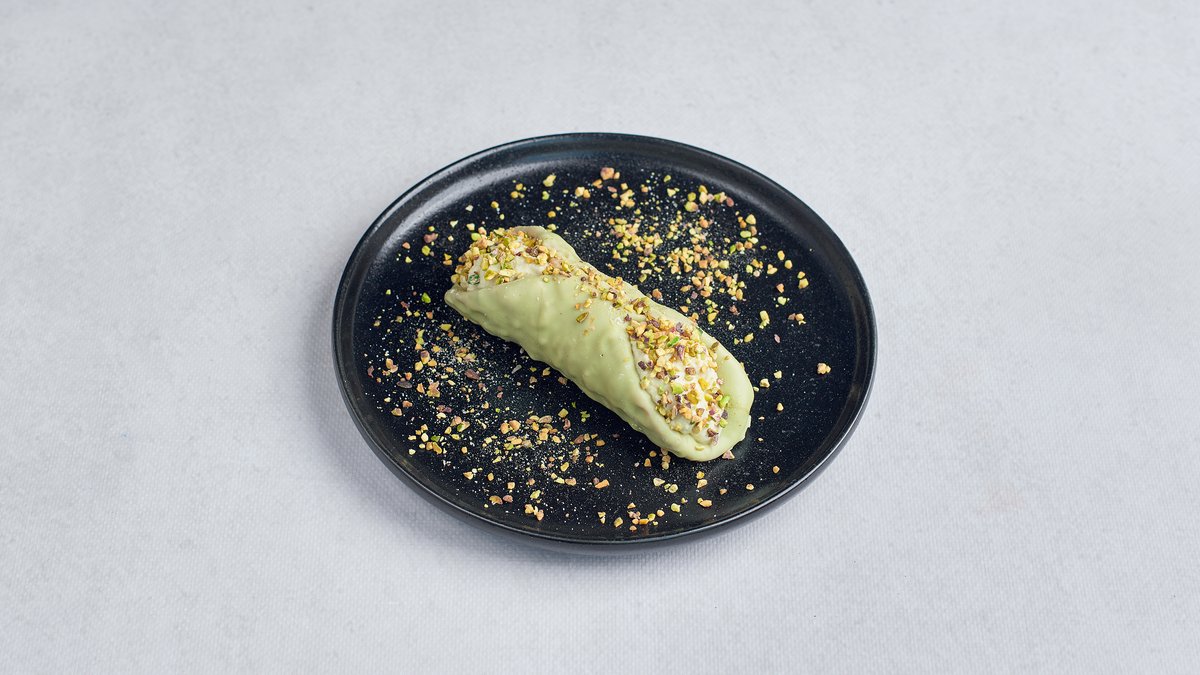 Chrupiąca rurka oblana białą czekoladą i wypełniona kremem pistacjowym na bazie ricotty