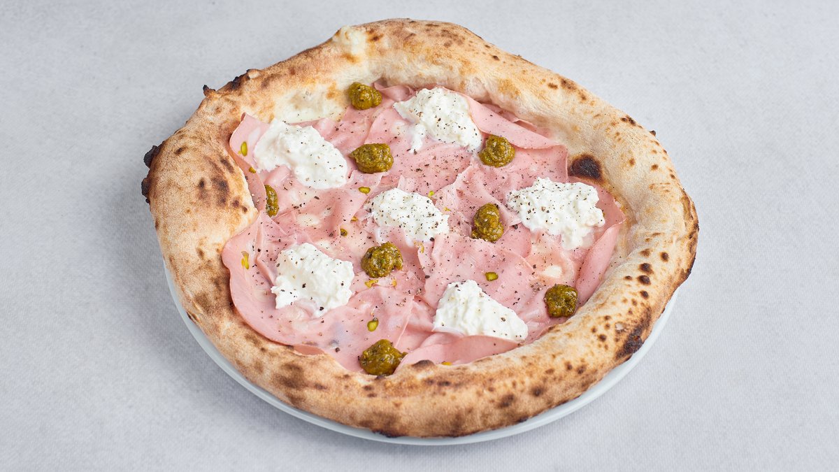 Mozzarella fior di latte, Mortadella Levoni z pistacją, Stracciatella, pesto pistacjowe, czarny pieprz
