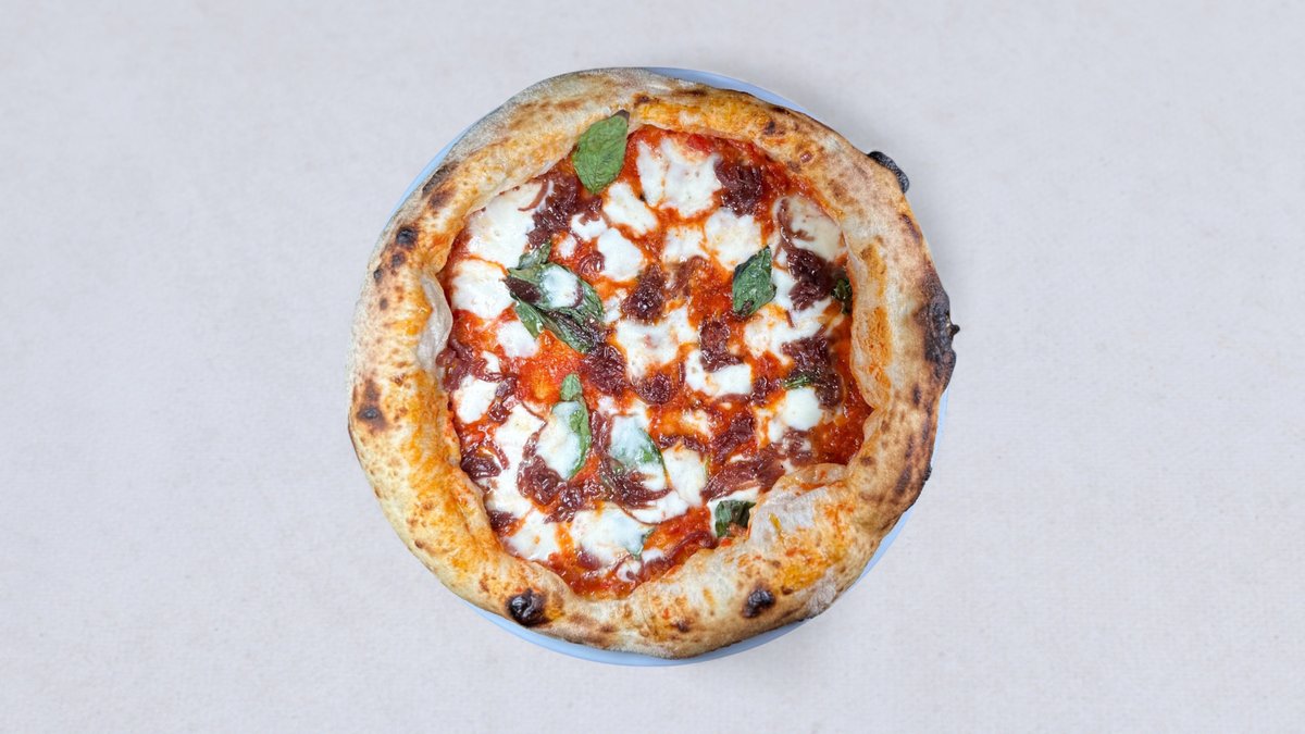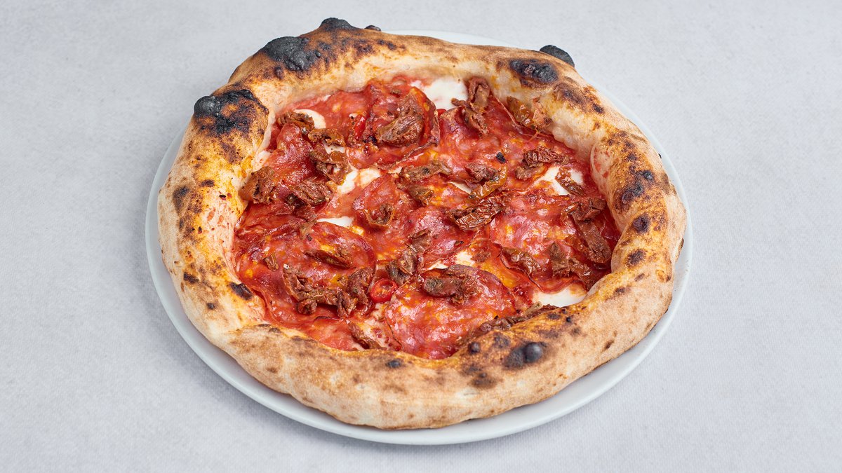 Pomidory San Marzano DOP, mozzarella fior di latte, Salame Ventricina Levoni, suszone pomidory, płatki chilli, papryczka chilli