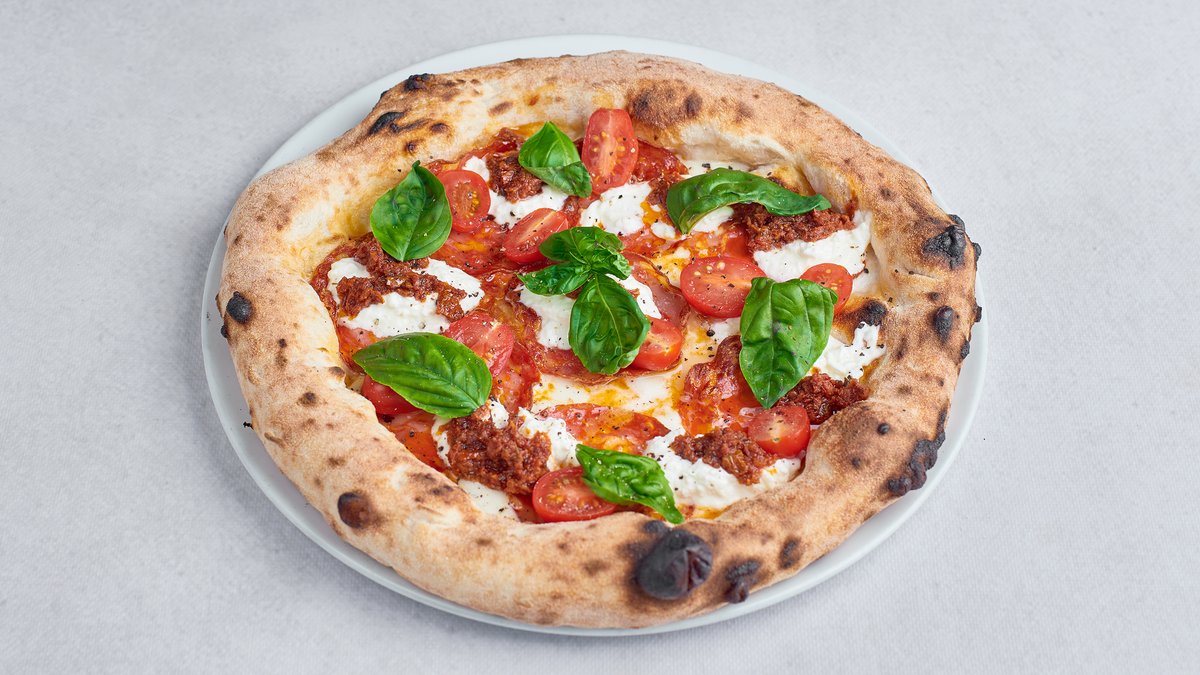 Sosz pomidorów San Marzano z `Ndują, wędzona mozzarella, karmelizowana czerwona cebula, Grana Padano 24-msc DOP, bazylia