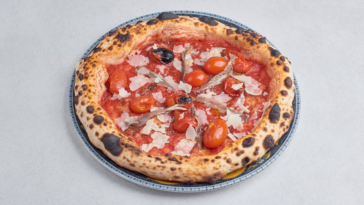 Pomidory San Marzano DOP, pieczone pomidorki datterini żółte i czerwone, filety anchois Armatore, Grana Padano DOP 24-msc, Oregano