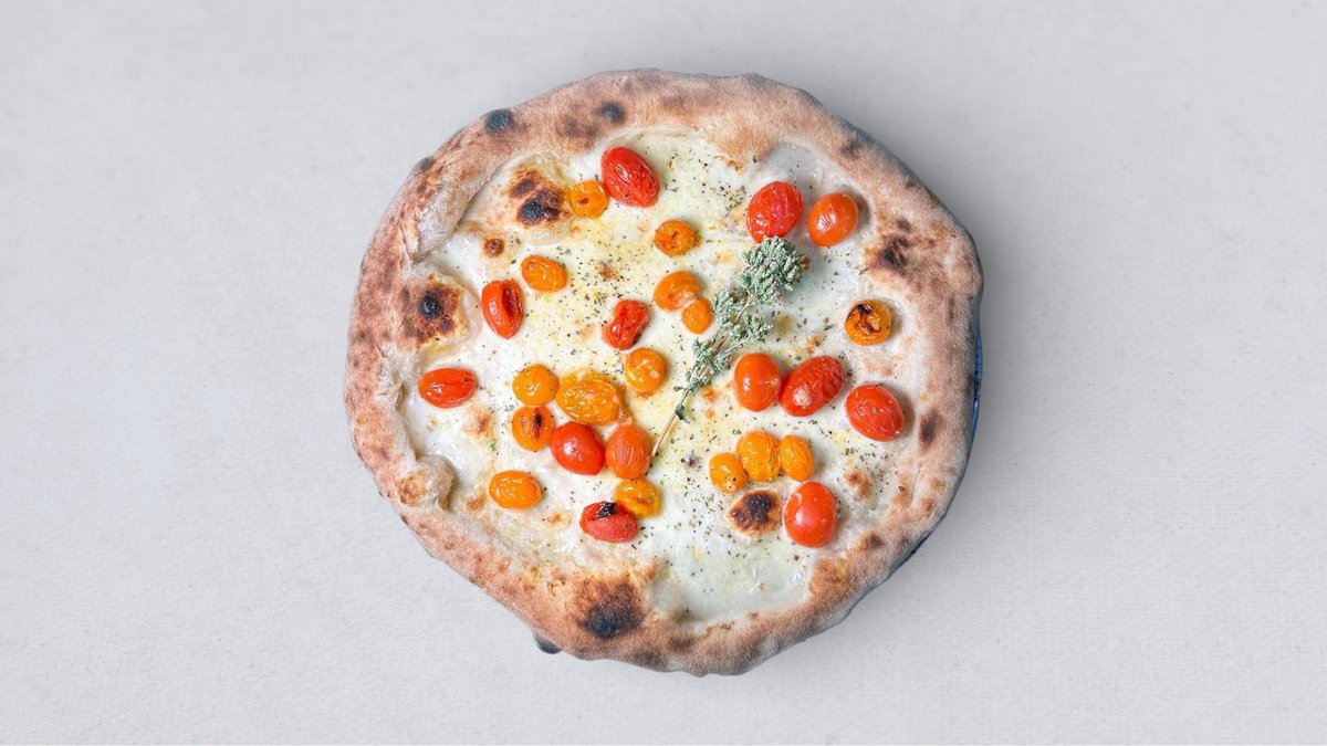 Pieczone pomodorini rossi e gialli, mozzarella fior di latte, Grana Padano DOP, sycylijskie oregano