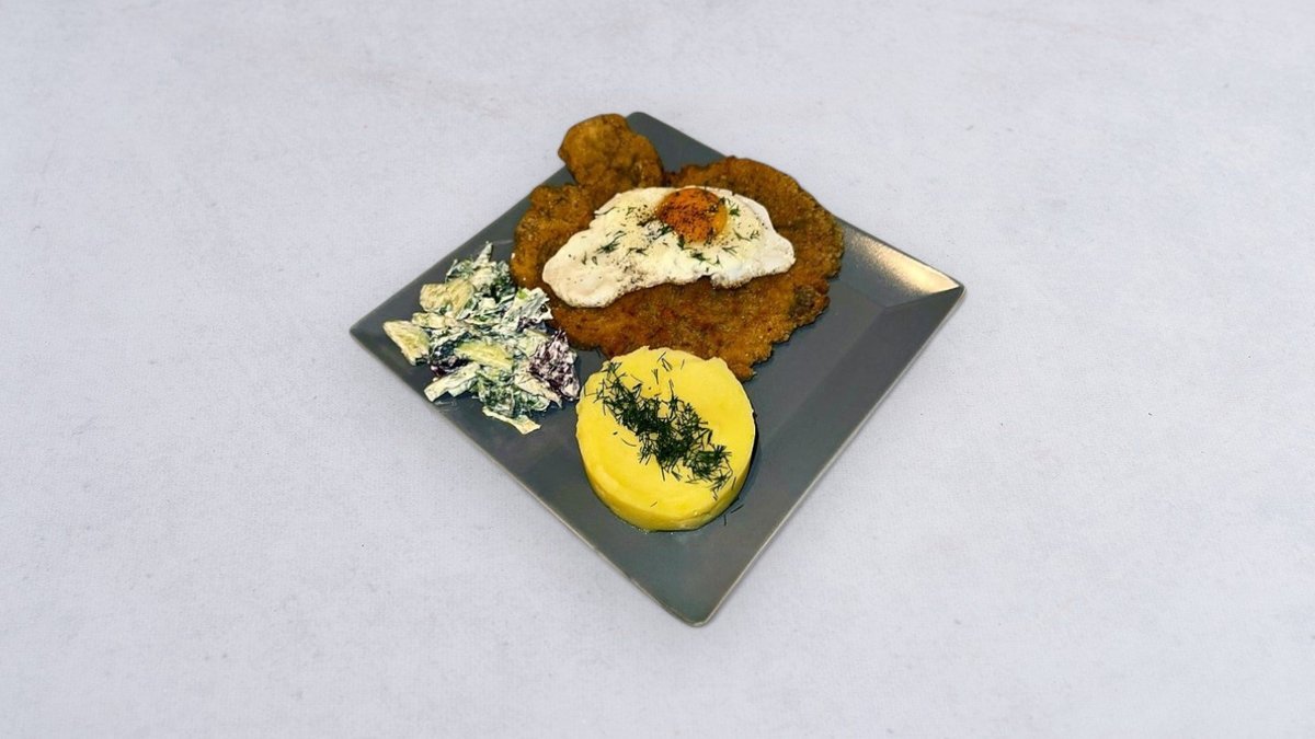 Kotlet schabowy z purée ziemniaczanym i sałatką mizerią