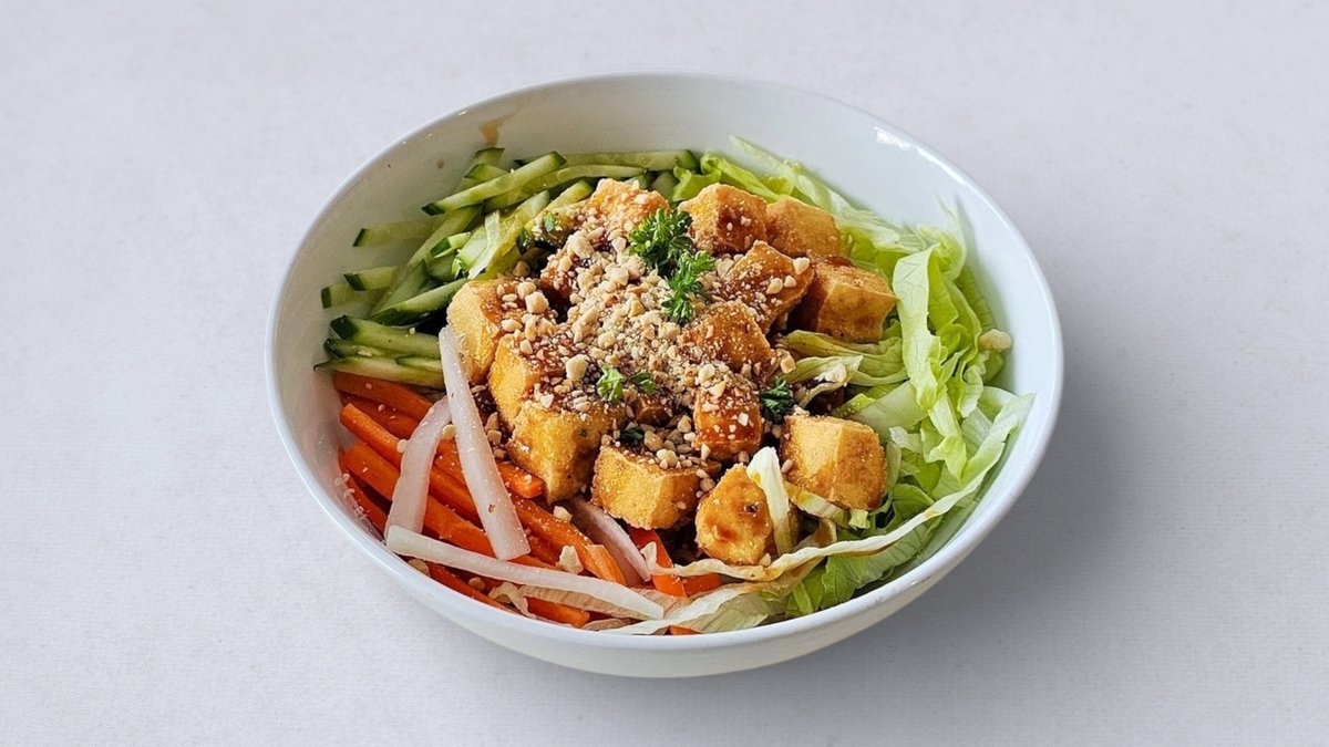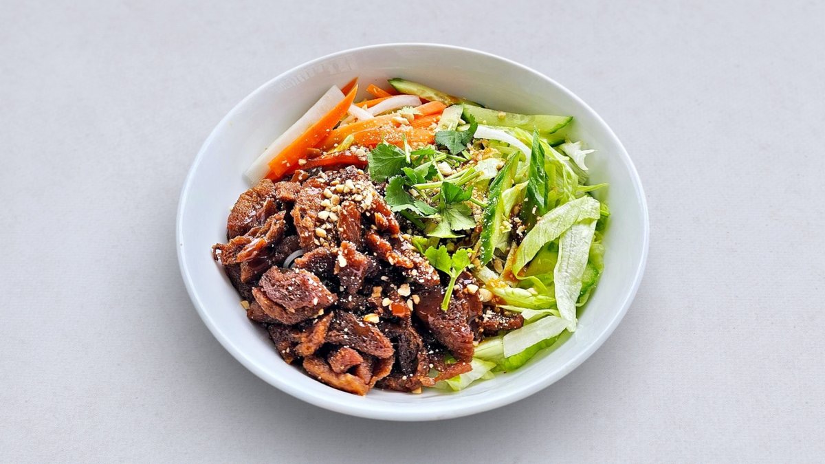 Miska z makaronem ryżowym w sosie nem, substytutem wołowiny, sałatą lodową, ogórkiem, orzeszkami ziemnymi, smażoną cebulą