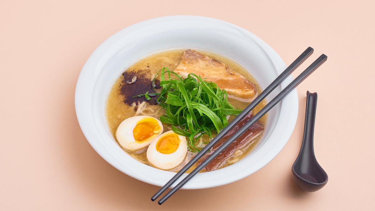 Klarowny bulion z kurczaka i bonito, makaron ramen pszenny (robiony na miejscu), glazurowana wieprzowina charsiew, marynowana tykwa, dymka, olej z palonego czosnku, jajko "zerówka" z ekologicznej hodowli. Cena zawiera koszt opakowania na wynos oraz opłatę konsumencką zgodną z dyrektywą SUP. The price includes the cost of takeaway packaging and the consumer charge in accordance with the SUP Directive
