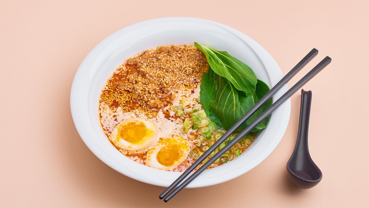 Kremowy pikantny bulion z sezamu i chilli, makaron ramen pszenny (robiony przez nas na miejscu), siekany kurczak, prażony sezam, dymka, pok choy, marynowane jajko "zerówka" z hodowli ekologicznej. Cena zawiera koszt opakowania na wynos oraz opłatę konsumencką zgodną z dyrektywą SUP. The price includes the cost of takeaway packaging and the consumer charge in accordance with the SUP Directive